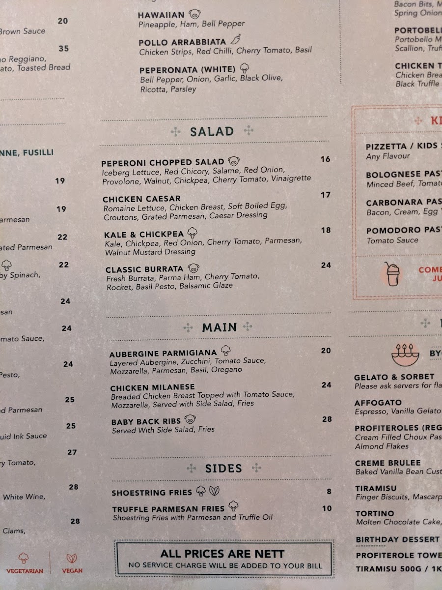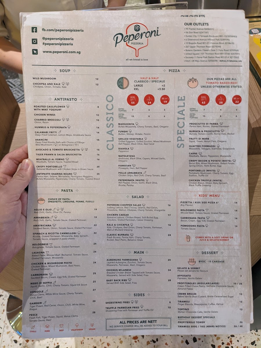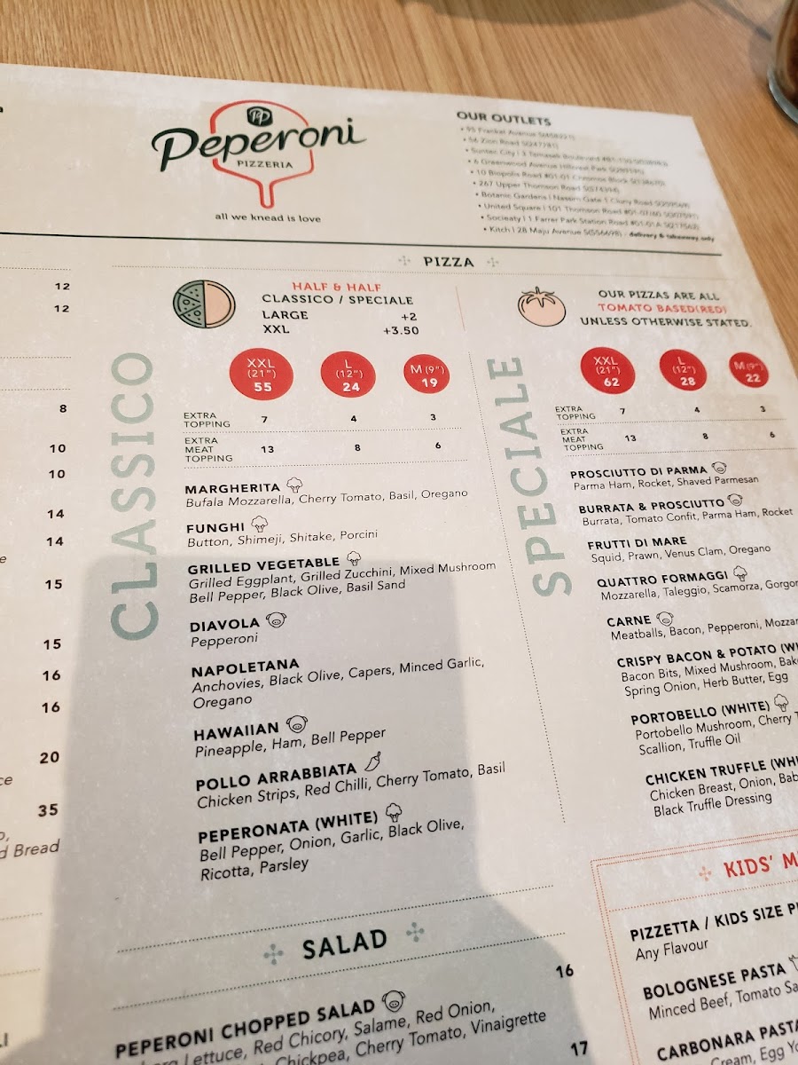 From a reviewer’s perspective, the menu at Peperoni Pizzeria offers a well-rounded and indulgent Italian spread that caters to both classic and adventurous palates. The pasta selection stands out with dishes like PUMPKIN GNOCCHI WITH BACON & SAGE OIL, SQUID INK PASTA, and PESTO RAVIOLI WITH BURRATA MOUSSE Ⓥ, while starters such as CHICKEN WINGS (8PCS) and ARANCINI (BOLOGNESE) (6PCS) provide satisfying beginnings. The true highlight is the extensive pizza lineup, ranging from 9" options like MEDIUM NAPOLETANA and MEDIUM BROWN BUTTER PULLED CHICKEN to 12" favorites such as LARGE MARGHERITA Ⓥ and LARGE PROSCIUTTO DI PARMA, all the way to indulgent 21" creations like XXL SALMON & ASPARAGUS, XXL QUATTRO FORMAGGI Ⓥ, and XXL CARNE. The flexibility of HALF&HALF pizzas adds a fun, customizable touch for groups. Complementing the mains are hearty plates like BABY BACK RIBS, CHICKEN MILANESE, and SEARED SALMON FILLET, alongside lighter options such as KALE, CAULIFLOWER & AVOCADO Ⓥ salad. Beverage choices, including San Pellegrino 1L (Sparkling), Asahi, and a curated wine list like Piccini Chianti DOCG, round out the experience. Overall, the menu delivers variety, generous portions, and a balance between comfort classics and premium offerings, making it a satisfying destination for casual dining or group gatherings.