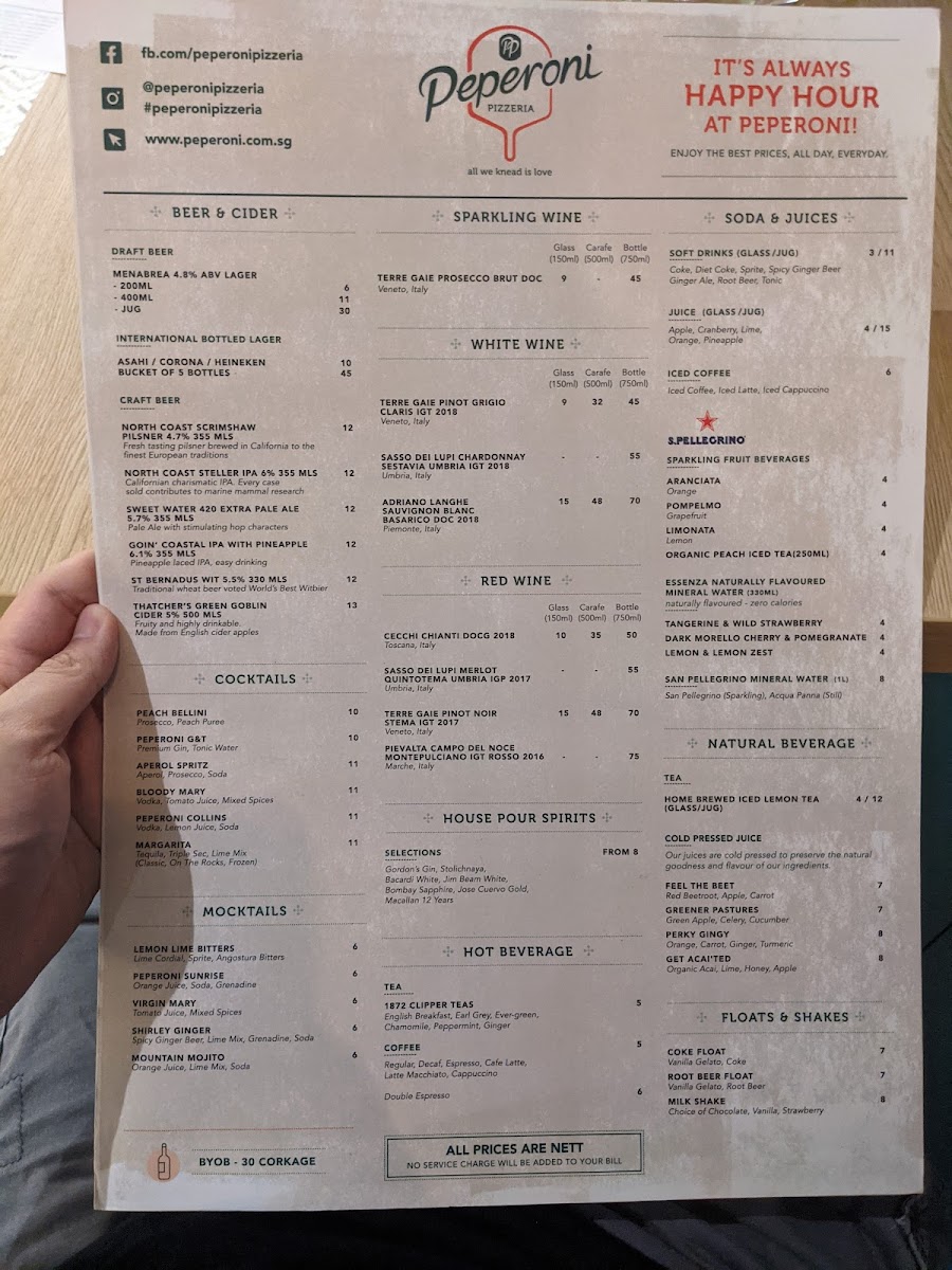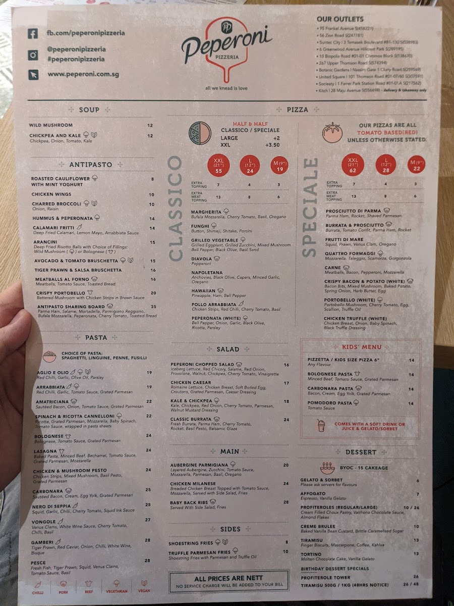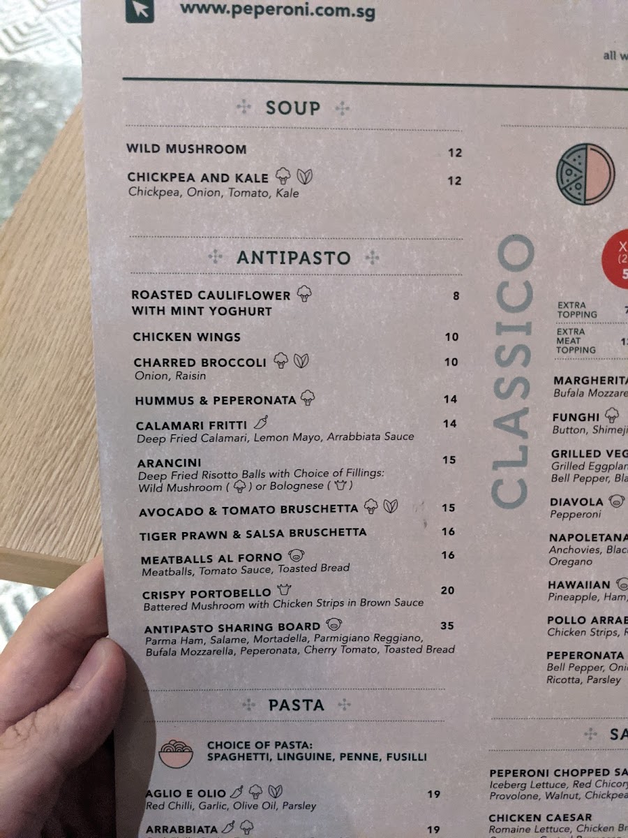 From a reviewer’s perspective, the menu at Peperoni Pizzeria offers a well-rounded and indulgent Italian spread that caters to both classic and adventurous palates. The pasta selection stands out with dishes like PUMPKIN GNOCCHI WITH BACON & SAGE OIL, SQUID INK PASTA, and PESTO RAVIOLI WITH BURRATA MOUSSE Ⓥ, while starters such as CHICKEN WINGS (8PCS) and ARANCINI (BOLOGNESE) (6PCS) provide satisfying beginnings. The true highlight is the extensive pizza lineup, ranging from 9" options like MEDIUM NAPOLETANA and MEDIUM BROWN BUTTER PULLED CHICKEN to 12" favorites such as LARGE MARGHERITA Ⓥ and LARGE PROSCIUTTO DI PARMA, all the way to indulgent 21" creations like XXL SALMON & ASPARAGUS, XXL QUATTRO FORMAGGI Ⓥ, and XXL CARNE. The flexibility of HALF&HALF pizzas adds a fun, customizable touch for groups. Complementing the mains are hearty plates like BABY BACK RIBS, CHICKEN MILANESE, and SEARED SALMON FILLET, alongside lighter options such as KALE, CAULIFLOWER & AVOCADO Ⓥ salad. Beverage choices, including San Pellegrino 1L (Sparkling), Asahi, and a curated wine list like Piccini Chianti DOCG, round out the experience. Overall, the menu delivers variety, generous portions, and a balance between comfort classics and premium offerings, making it a satisfying destination for casual dining or group gatherings.